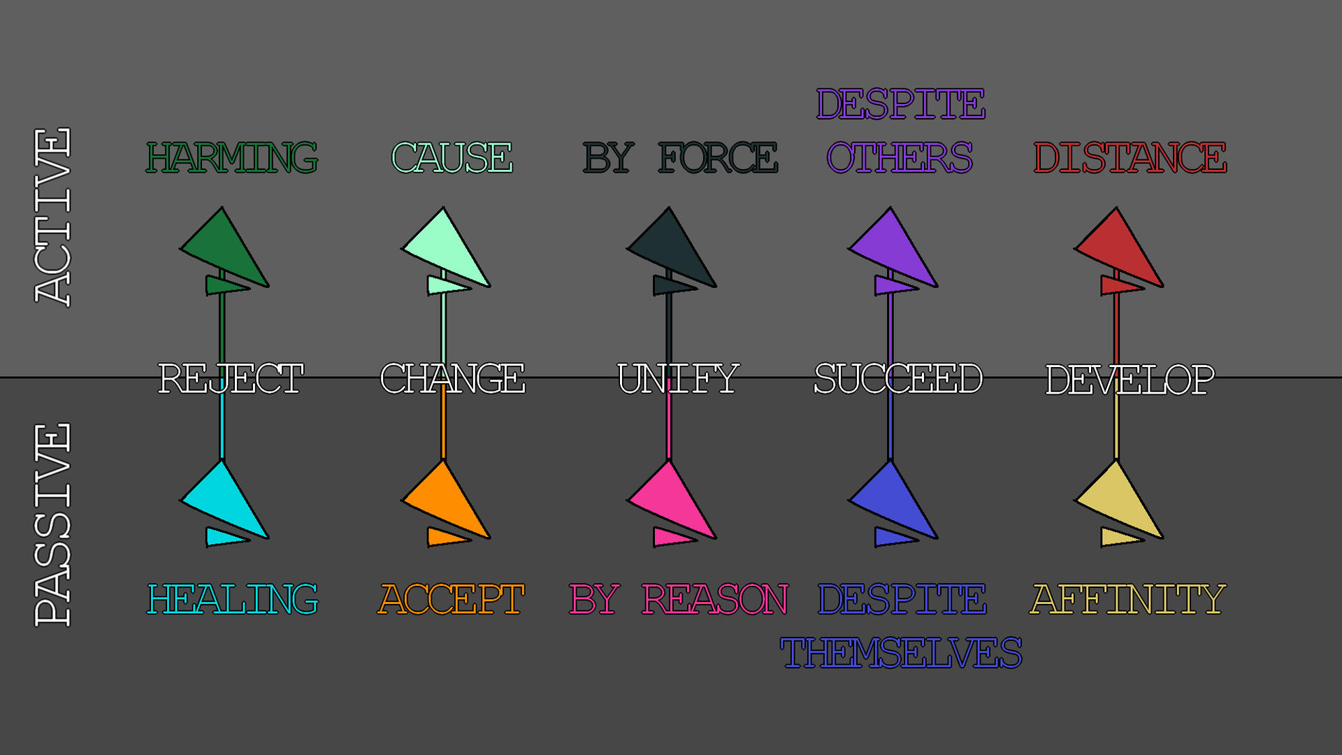 Green and Cyan: As the ones that reject harming and healing, respectively, the gates would be a test of loyalty. You must learn to understand what drives you to care towards those close to you. What would you be willing to give up for them? How much of yourself would you sacrifice, if it meant a better life for those you love? The truth is, oftentimes the overbearing nature of both great highbloods ends up harming those around them, and stops them from properly healing, as you are not always truly aware of what's best for others. As you cross the final gate, be sure that you can better help people by also recovering from your wounds. They are not a burden for you to bear alone.