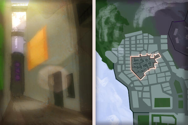 A collection of alleyways that are almost completely surrounded by railing, as they've been built significantly lower down, to the degree that the rooftops of all buildings there coincide with the average floor height of the rest of Harborside. They are only accessible via flight, elevators, and a singular set of stairs.