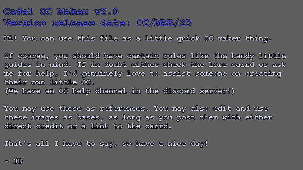 So, want a cadel OC of your own? Cool, cool. Here's a couple resources that could prove useful when making one (more are vaguely planned and will be added one day):